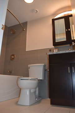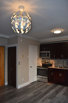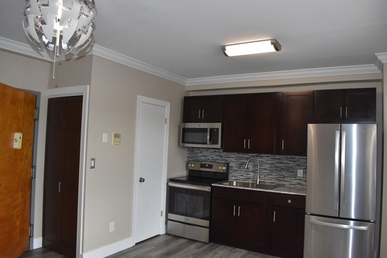1-bedroom apartment featuring new luxury LVP flooring, stylish urban window treatments, chic ceiling fixtures and chandeliers, laundry closet featuring a brand new washer/dryer unit, and crown molding detail in each room. The kitchen features a pantry, stainless steel appliances, glass top electric range, over the range microwave, granite counter tops, extra deep stainless steel sinks, as well as urban kitchen cabinetry & accents. The bathroom features ceramic tile flooring & walls, extra deep soaking tub with shower, urban style vanity with granite counter top, tri-view medicine cabinet, and high-end American Standard fixtures.