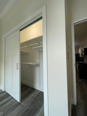 1-bedroom apartment featuring unique built-in storage, new luxury LVP flooring, stylish urban window treatments, chic ceiling fixtures and chandeliers, laundry closet featuring a brand new washer/dryer unit, and crown molding detail in each room. The kitchen features a custom backsplash, stainless steel appliances, glass top electric range, over the range microwave, granite counter tops, extra deep stainless steel sinks, as well as urban kitchen cabinetry & accents. The bathroom features ceramic tile flooring & walls, extra deep soaking tub with shower, urban style vanity with granite counter top, tri-view medicine cabinet, and high-end American Standard fixtures.