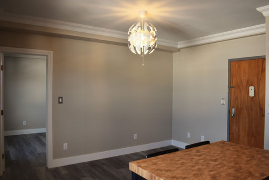 1-bedroom apartment featuring new luxury LVP flooring, stylish urban window treatments, chic ceiling fixtures and chandeliers, laundry closet featuring a brand new washer/dryer unit, and crown molding detail in each room. The kitchen features a pantry, stainless steel appliances, refrigerator with ice maker, glass top electric range, over the range microwave, granite counter tops, extra deep stainless steel sinks, as well as urban kitchen cabinetry & accents. The bathroom features ceramic tile flooring & walls, extra deep soaking tub with shower, urban style vanity with granite counter top, tri-view medicine cabinet, and high-end American Standard fixtures.