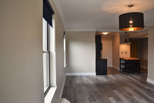 1-bedroom apartment featuring new luxury LVP flooring, stylish urban window treatments, chic ceiling fixtures and chandeliers, laundry closet featuring a brand new washer/dryer unit, and crown molding detail in each room. The kitchen features a pantry, stainless steel appliances, refrigerator with ice maker, glass top electric range, over the range microwave, granite counter tops, extra deep stainless steel sinks, as well as urban kitchen cabinetry & accents. The bathroom features ceramic tile flooring & walls, extra deep soaking tub with shower, urban style vanity with granite counter top, tri-view medicine cabinet, and high-end American Standard fixtures.